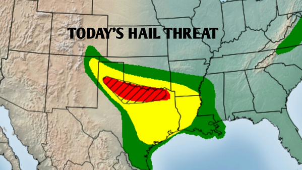 Risk of some very large (2″ diameter or bigger) hail today across north TX, far south OK. A tornado or two. http://t.co/4F7oyX1faV