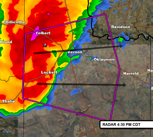 4:30pm – Confirmed tornado near LOCKETT, TX. Take cover now in LOCKETT VERNON OKLAUNION http://t.co/R0CjhRIldQ