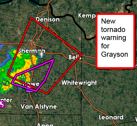 New tornado warning for Grayson, TX. May 10, 2015 | 3:41 PM CST Featured New tornado warning for Grayson, TX. http://t.co/Iw2wSeCrs9