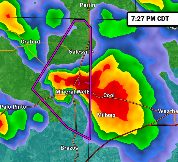 7:30pm – Another tornado reported right near Mineral Wells, TX! Take cover now.