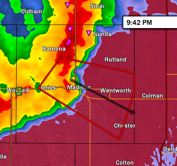 9:45pm – MADISON, SD… take shelter now! Tornado Warning until 10:15pm.