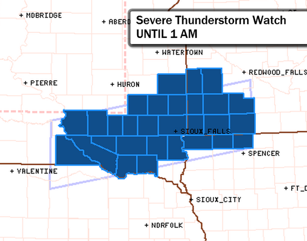 Severe T-Storm Watch issued for parts of southeast SD, southwest MN, northwest IA until 1am. http://t.co/rAKYrqWJ3b