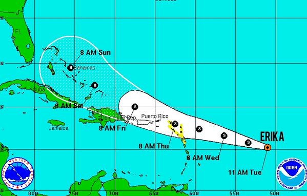 Latest official forecast for Tropical Storm Erika. Expected to become a hurricane Saturday morning… http://t.co/CdNKhU6Nh2