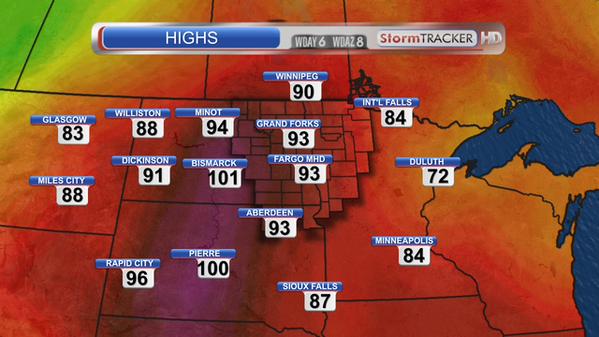 RT @AaronWhiteTV: Another HOT one across the region! Record high tied in Bismarck! #NDwx #MNwx #SDwx http://t.co/1xOoYroJDs