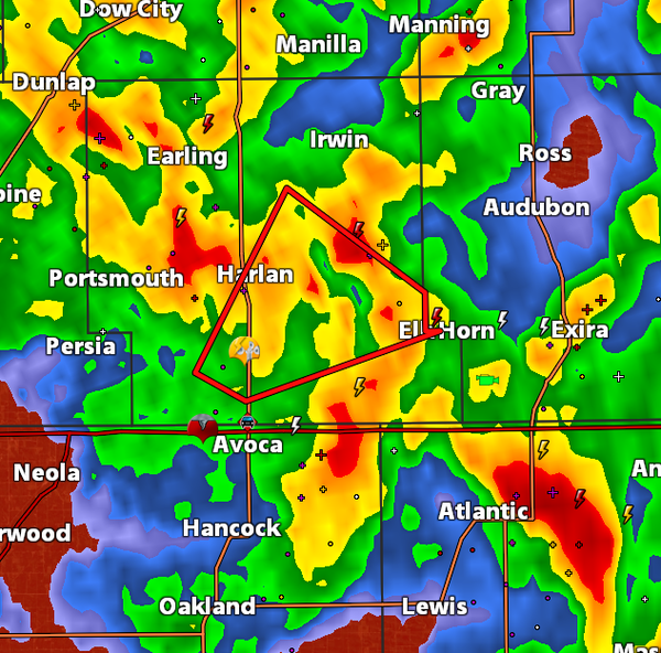 2:10pm — 76mph wind gust and power poles blown down south of Harlan, IA. Funnel cloud reported earlier.