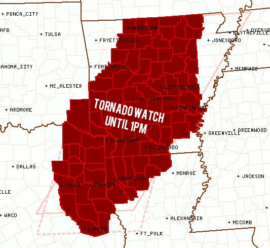Tornado Watch in effect for most of Arkansas, and parts of northeast Texas, northwest Louisiana. https://t.co/41qnnJMicq