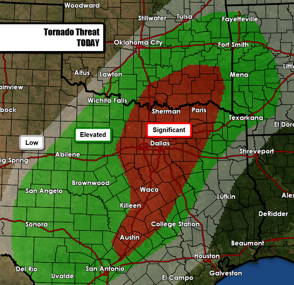 Latest tornado threat map for today. Includes Dallas/Ft. Worth. Temps are in the mid-70s w/ upper 60s dewpoints.