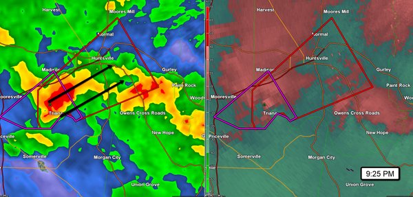 Tornado Warning now includes Huntsville, Alabama for a rotating thunderstorm near Triana. Head to shelter!