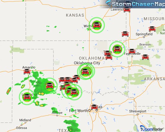 Storm chasers are streaming LIVE (green, pulsing cars), awaiting severe storms