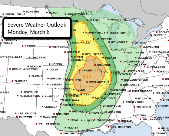 An Enhanced risk for severe storms is in place for the Ozarks and northeastward into parts of Iowa and Illinois. This includes Kansas City and St. Louis, MO, and Overland Park, KS. Here, strong winds, large hail, and isolated tornadoes will be possible. The greatest threat for tornadoes is in central Missouri and extreme eastern Kansas. A few tornadoes could be strong.
